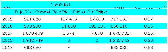 El MAR generó información sobre el volumen, pudiendo diferenciar entre San Felipe, las comunidades rurales en el Bajo Río y las comunidades Cucapá. En el caso del Bajo Río el monitoreo fue realizado por personas de las comunidades circundantes al campo pesquero El Zanjón. Si bien, los resultados muestran volúmenes menores a los reportados en los avisos de arribo, permiten ver tendencias y detectar temas relevantes como el incremento en el número de embarcaciones y la presencia de pangas pescadores de otros sitios. En la Tabla 10 se puede observar un aumento del 373% del volumen de pesca registrado por las comunidades Cucapá entre 2015 y 2018. Este incremento coincide con la prohibición de la pesca en 2017 mediante la compensación y la excepción para el caso de los pueblos originarios; esta coincidencia sugiere que la prohibición generó un desplazamiento del esfuerzo pesquero vecino hacia las comunidades Cucapá.