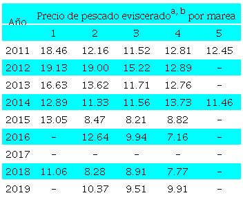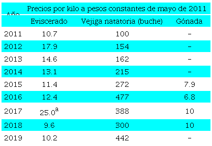 Fuente: elaboración propia con base en los precios reportados directamente en las bases de datos del Monitoreo Administrativo Regional de 2011 a 2015; los reportes económicos 2015 y 2016 elaborados por Environmental Defense Fund de México para estos años; y el informe técnico del estado de Sonora para 2019.