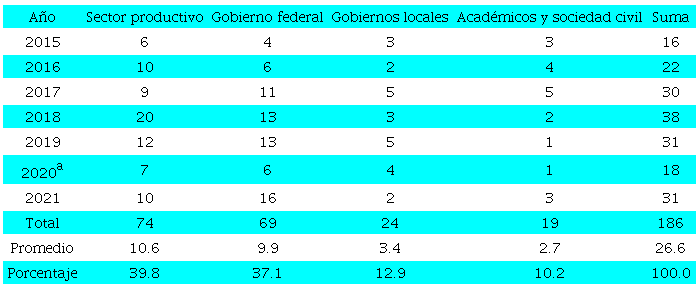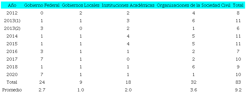 El GTC ha sesionado 10 veces desde su creación, teniendo participación del gobierno federal, gobiernos estatales, instituciones académicas y organizaciones de la sociedad civil. Las reuniones del GTC son de carácter técnico no vinculantes con una participación promedio de 9 personas por reunión, tal como se muestra en la Tabla 2.