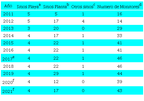 El MAR inició en 2011 en El Golfo de Santa Clara, como un proyecto piloto en el que participaron 16 monitores y ha continuado hasta 2021. A lo largo de estos 10 años de monitoreo, este esfuerzo evolucionó hasta tener 46 monitores participando en 2017-2019 mayormente mujeres y sujetas a un intenso programa de capacitación. Los componentes que han sido más estables en el tiempo son el monitoreo en sitios de arribo (playa) y el monitoreo en las plantas recibidoras; sin embargo, también han existido otros esfuerzos como el monitoreo en carretera, el doméstico y el monitoreo en cuatrimoto, tal como se muestra en la Tabla 5.