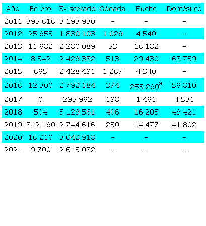 El MAR lleva el registro de cuatro diferentes productos: pescado entero, pescado eviscerado, buche y gónada. La Tabla 6 muestra los volúmenes registrados desde 2011 hasta 2021; entre los años 2014 a 2019 también se tuvieron registros diferenciados para el pescado para consumo doméstico. Este dato es importante para dar seguimiento a la mortalidad por pesca ya que no se descuenta de la cuota de captura. Como se puede ver en la Tabla 6, esta cantidad no es despreciable y representa del uno al tres por ciento de la captura total, ya que es el medio de cambio que se utiliza para pagar por el proceso de eviscerado.