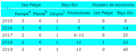 b En 2015 y 2016 se pusieron monitores en las tres principales plantas recibidoras, en los años siguientes no se tuvieron monitores permanentes sino que se hacían recorridos por las plantas.