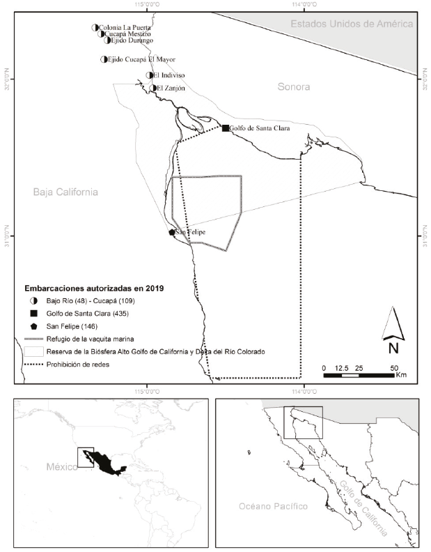 La curvina golfina (Cynoscion othonopterus) es una especie endémica del Golfo de California descrita por Jordan y Gilbert (1882) que alcanza una talla máxima de 98.5 cm1 y puede llegar a vivir hasta 9 años (Román-Rodríguez, 2000). La mayor parte de su captura sucede dentro de la Zona de Reserva de la Biosfera del Alto Golfo de California y Delta del Río Colorado (RBAGCDRC), en los meses de primavera durante su agregación reproductiva (Erisman et al., 2022). Esta especie se captura a bordo de embarcaciones de fibra de vidrio de hasta 10.5 metros de eslora con motor fuera de borda, conocidas como pangas; y su aprovechamiento se encuentra regulado por la Norma Oficial Mexicana NOM-063-PESC-2005-PESC-2005, Pesca responsable de curvina golfina (Cynoscion othonopterus) en aguas de jurisdicción federal del Alto Golfo de California y Delta del Río Colorado (Diario Oficial de la Federación [DOF], 2007a). Esta norma establece que la captura debe realizarse con redes de enmalle con luz de malla de 5 3/4 de pulgada (14.6 cm) y 293 m de longitud tendida en forma de encierro, que la talla mínima de captura es de 65cm. y que debe haber una cuota máxima de captura. Las comunidades que realizan esta actividad son El Golfo de Santa Clara, en Sonora y San Felipe, Cucapá y comunidades rurales del Bajo Río, en Baja California. El número de embarcaciones autorizadas para 2019 fue de 435, 146, 109 y 48 respectivamente para cada comunidad, de 2020 a la fecha se ha comportado como si fuera de acceso abierto. La Figura 1 muestra las comunidades que realizan la actividad y el número de embarcaciones por comunidad.