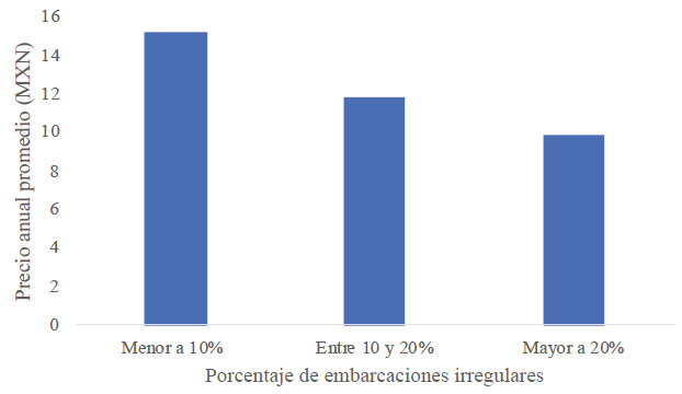 Al observar los datos de pangas irregulares mostrados en la tabla 11 con los datos de caída en precios de la tabla 13 se puede observar que los años con menor cantidad de pesca irregular (2013 y 2014) fueron los años que registraron una menor caída en precios. Informes preliminares de la temporada 2021, en donde toda la pesca fue irregular, muestran una caída de precios del 65%, la mayor registrada en 10 años. Lo anterior sugiere una posible relación entre la tolerancia al libre acceso a la pesca y la caída de precios, tal como se muestra en la Figura 2. Para demostrar esta relación sería necesario realizar análisis econométricos de regresión múltiple que permitieran evaluar la significancia de factores como la irregularidad, la temporada de cuaresma (en la que aumentan los precios), la calidad del producto, la venta de producto “sin papeles” y la saturación del mercado.