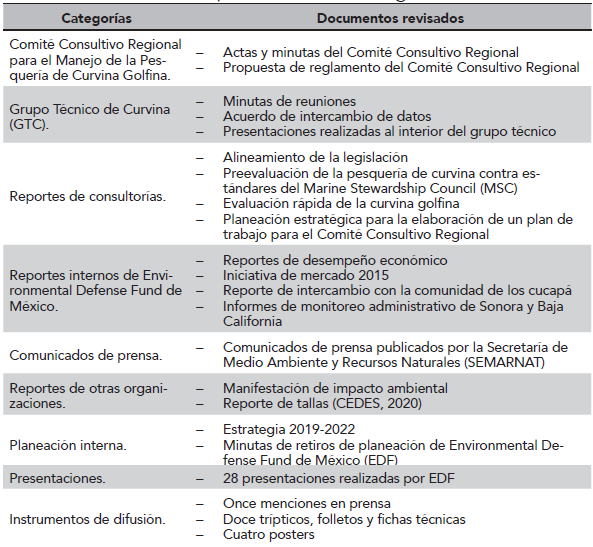 Para la reconstrucción y descripción de la pesquería de curvina golfina y la importancia de la participación social en su manejo se utilizaron cinco fuentes básicas de información: (1) revisión de literatura gris, (2) revisión de los instrumentos jurídicos aplicables, (3) revisión de la literatura científica convencional, (4) conversaciones con actores clave, y (5) reconstrucción de bases de datos.