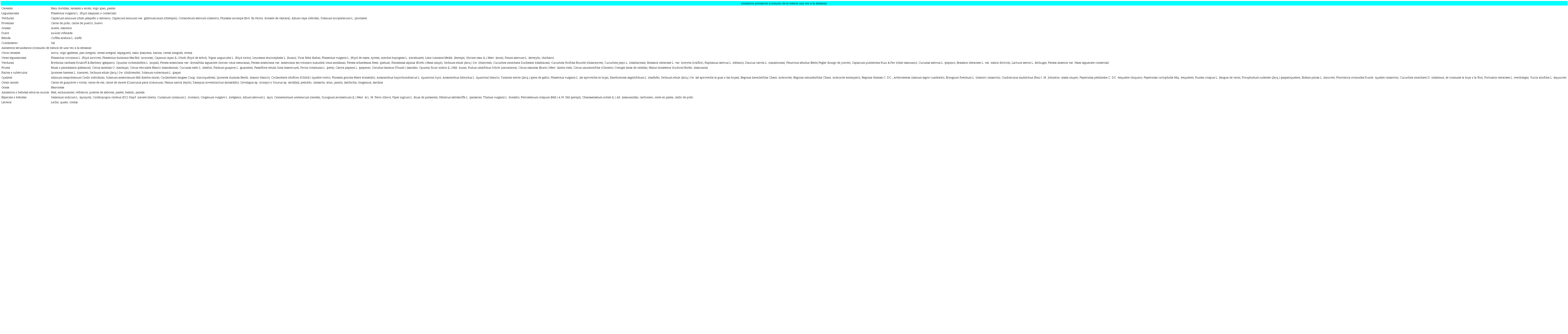En las encuestas a familias campesinas se registraron 159 alimentos, 20 primarios y 139 secundarios. Los alimentos primarios son el maíz (que se consume en tortillas, tamales, masa para comidas y atoles), frijoles, carne de pollo y puerco, huevo, pasta, pan, chiles, jitomates, tomate de cáscara, cebolla, aceite, manteca, cilantro, sal, café y azúcar refinada (véase Tabla 1). Los alimentos secundarios son otros cereales (arroz, trigo, avena, productos industrializados de maíz), otras leguminosas (frijoles, huaxi, ejotes, soya, alverjón, lenteja, chícharo), otras verduras, tubérculos, raíces, quelites, otras carnes, grasas, dulces, lácteos, especias y condimentos (véase Tabla 1).