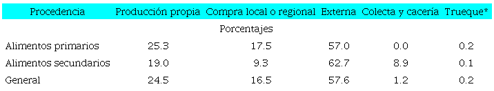 Los alimentos primarios y secundarios procedieron de cinco fuentes: 57.6% de mercados externos a la región, 24.5% de la producción propia y 16.5% de la misma localidad o de la región a través de la compra. Los alimentos de recolecta y caza, así como los que se consiguieron mediante trueque, regalo o cambio por mano de obra, tuvieron una muy baja representación en la dieta, a excepción de un conjunto de alimentos secundarios que se colectan (8.9%) y que están representados en su mayoría por los quelites (véase Tabla 2).