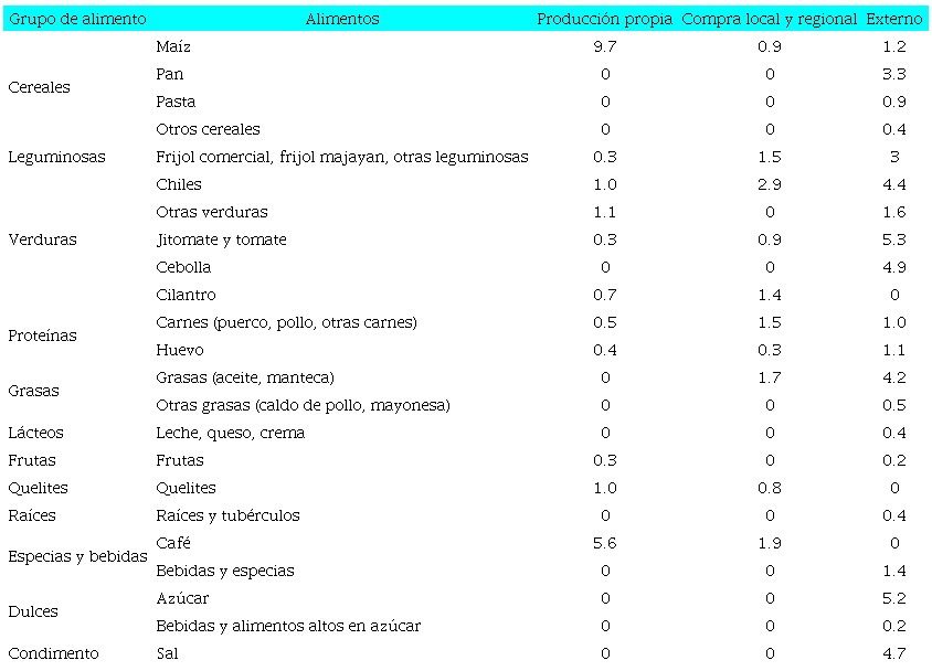 Los alimentos de procedencia externa presentan una media de consumo semanal superior a la de los alimentos de producción propia y a los de producción local y regional. Los alimentos que los campesinos producen de forma típica, por ejemplo, las leguminosas, representadas sobre todo por los frijoles y en particular por el frijol local majayan, tienen un consumo promedio de 1.8 veces a la semana frente a 3 veces a la semana del frijol comercial. Esta situación se repite con los chiles, el jitomate, el tomate de cáscara, otras verduras, el huevo y la manteca, cuyo consumo se satisface sobre todo con productos de procedencia externa. Algunos alimentos provinieron en su totalidad del exterior de la región, pues no se producen en ella: pan, pasta, cebolla, otras grasas (caldo de pollo y mayonesa), lácteos, raíces y tubérculos, especias, otro tipo de cereales, dulces y sal (véase Tabla 3).
