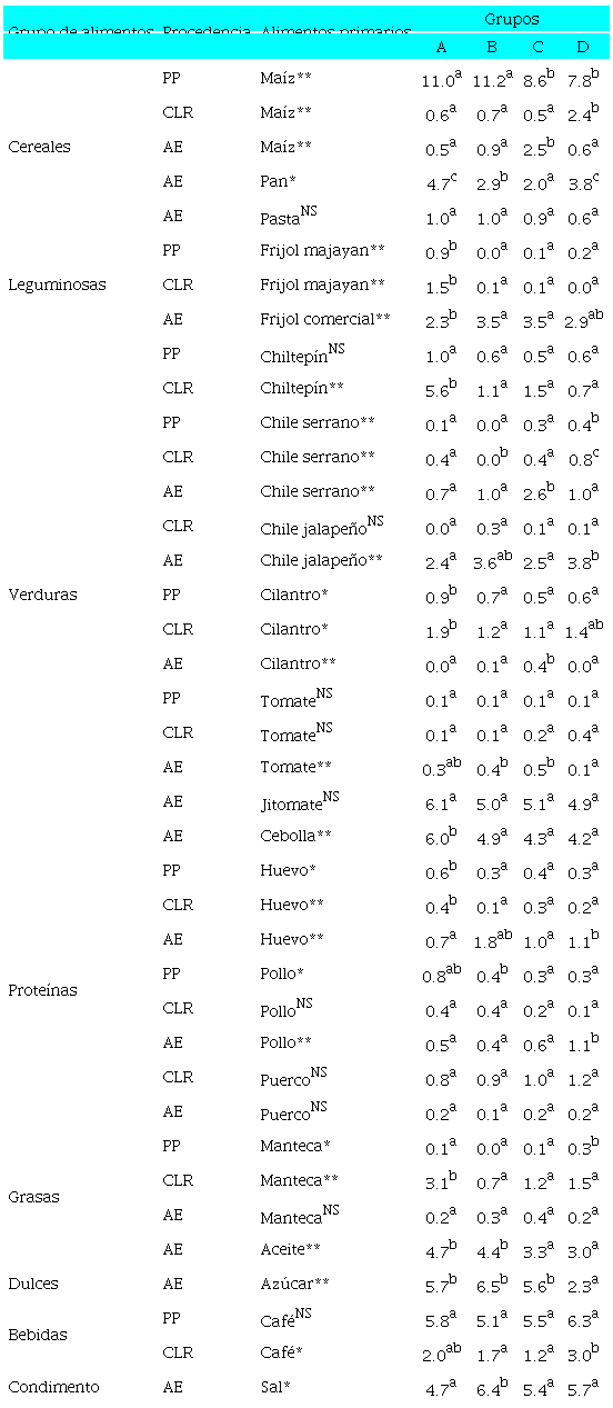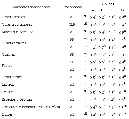 En lo que concierne a los alimentos secundarios, en seis grupos de estos se manifestaron diferencias significativas (p ≤ 0.05) (véase Tabla 5). En el de las verduras, las familias del grupo D consumen más las de producción propia que los demás grupos. Las del grupo B comen más las de procedencia externa. El grupo D muestra el mayor consumo de quelites y frutas, de producción propia y externa, lácteos, especias y bebidas. A pesar de su mayor orientación a consumir productos externos, los grupos B y C consumen más quelites que el grupo A.