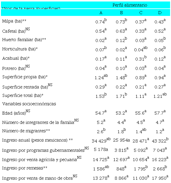 Entre perfiles se verificaron diferencias significativas en el ingreso anual, en el ingreso por remesas y en el número de migrantes por familia. En cambio, la edad de las personas encuestadas y el número de miembros por familia no muestran diferencias significativas. Las familias de los grupos A y D tienen, en promedio, ingresos más altos que las familias de los grupos B y C. Sin embargo, solo en las remesas se observaron diferencias significativas. En este rubro, el grupo C exhibe el más bajo ingreso. Por otro lado, los grupos A y B presentan más migrantes por familia que el grupo D (véase Tabla 6). Respecto al uso de la tierra, se observaron diferencias significativas en las superficies de milpa, huerto familiar, horticultura y acahual y en las superficies rentadas, propias y totales (véase Tabla 6). Las familias de los grupos A y B tienen la mayor superficie total, propia y de milpa. Las familias de los perfiles A y D destinan mayor superficie para la horticultura y, junto con las del grupo B, cuentan con las mayores superficies de huerto familiar. Las familias del grupo B tuvieron mayor superficie total. Sin embargo, exceptuando el maíz, presentan un bajo consumo de alimentos de producción propia, local y regional y comen con mayor frecuencia alimentos de procedencia externa. Las familias del grupo C cultivan menores superficies de los diferentes agroecosistemas y mayores superficies de acahual, lo que sugiere una tendencia al abandono de actividades agrícolas. También comen más alimentos de procedencia externa (véase Tabla 6).