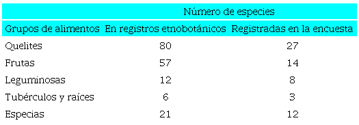 Hay muy baja frecuencia de consumo (menos de una vez a la semana) de tubérculos, raíces, semillas, frutas, verduras y especias locales, aunque en la región se tienen registros etnobotánicos de más de doscientas especies comestibles (Martínez et al., 1995). De las especies halladas en dichos registros, una baja proporción se usa a menudo y muchas no se mencionaron. En esta situación se destacan los quelites y las frutas, grupos en los que menos de la mitad de las especies registradas como comestibles por otros autores fueron mencionadas en la encuesta (véase Tabla 7).