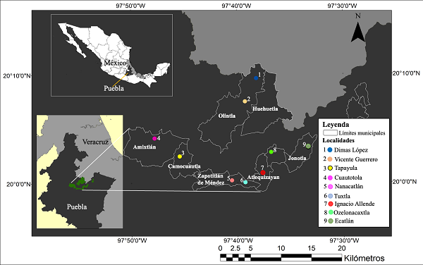 Se examinó la dieta de 270 familias campesinas de nueve localidades pertenecientes a siete municipios del Totonacapan poblano. Dichas localidades tienen una población de entre 1 300 y 2 800 personas. Pertenecen a la categoría administrativa estatal denominada Juntas Auxiliares y se ubican en los climas cálido húmedo A(f) y semicálido húmedo (A)C(fm), en un intervalo altitudinal de entre 250 y 900 metros sobre el nivel del mar (msnm) (véase Figura 1). Se establecieron esos criterios para facilitar la interpretación de los daños, porque de esa forma se tiene mayor homogeneidad en el tipo de clima y en el tamaño de la población, lo que influye en los alimentos disponibles (Gutiérrez y Magaña, 2017). De cada comunidad se hizo una selección aleatoria de 30 familias a encuestar, a partir de una lista que se creó enumerando las casas que se observaron en Google Maps®. Para la selección de las familias se establecieron dos criterios: que cultivaran milpa y que pertenecieran al grupo originario totonaco. Se solicitó la autorización de las autoridades municipales, auxiliares y de los jefes de familia de cada hogar para aplicar las encuestas. Estas abordaron cuatro temas: 1) datos socioeconómicos, 2) estimación del ingreso económico, 3) superficie cultivada de los agroecosistemas y 4) patrón alimentario de las familias. Se integraron 21 preguntas para abordar dichos temas.