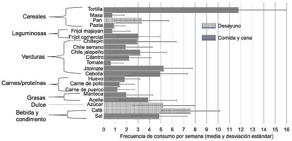 Por lo general las familias hacen tres comidas al día. El desayuno incluye café con azúcar, cuya media de consumo es de más de siete veces a la semana, y el pan de harina de trigo, que se consume más de tres veces a la semana. En la comida y en la cena, lo que se come con mayor frecuencia es la tortilla (más de 11 veces a la semana), el jitomate y la cebolla (más de 5 veces a la semana), el aceite, el chiltepín, el chile jalapeño y el frijol comercial (más de tres veces a la semana). El huevo se consume dos veces a la semana; la carne y la pasta, una vez a la semana (véase Figura 2). La sal se usa más de 4 veces a la semana en la mayoría de los alimentos de la comida y la cena.