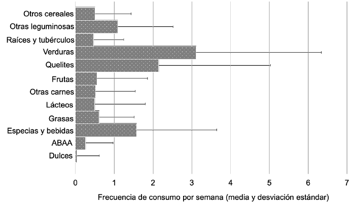 Los 139 alimentos secundarios, considerados de forma individual, se consumen menos de una vez a la semana. Varios de ellos, ya agrupados, se consumen más de una vez a la semana. Entre estos conjuntos sobresalen las verduras, con una media de consumo mayor a tres veces a la semana, y los quelites, con una media mayor a dos veces a la semana. Las otras leguminosas, el grupo de las especias y las bebidas se aprovecharon más de una vez a la semana. Otros cereales, raíces y tubérculos, lácteos, frutas, grasas, alimentos y bebidas con alto contenido de azúcar, además de carnes embutidas, sardina y atún enlatados, se consumieron menos de una vez a la semana (véase Figura 3).