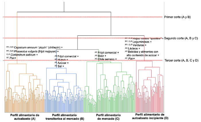 Las dietas de las 270 familias encuestadas forman, según la frecuencia de consumo y la procedencia de los alimentos, cuatro grupos: perfil alimentario de autoabasto (A), perfil alimentario de autoabasto incipiente (D), perfil alimentario transitorio al mercado (B) y perfil alimentario de mercado (C). Los grupos A y D comprenden las familias con la mayor frecuencia de consumo de alimentos de producción propia y de producción local y regional. Los grupos B y C tienen el mayor consumo de alimentos de procedencia externa. El grupo A se diferencia del D en que el último tiene un consumo mucho más alto de alimentos secundarios de procedencia local: leguminosas, verduras y quelites, y de componentes de procedencia externa: lácteos y un bajo consumo de azúcares. El grupo A tuvo bajo consumo de algunos grupos de alimentos secundarios (quelites, frutas, especias y bebidas y lácteos) y tuvo un alto consumo de alimentos primarios: frijol majayan, cilantro y chiltepín (véase Figura 4). Los grupos B y C tienen un alto consumo de frijol comercial y se diferencian en el consumo del chile serrano y en la compra de tortillas, que son mucho mayores en el grupo C.