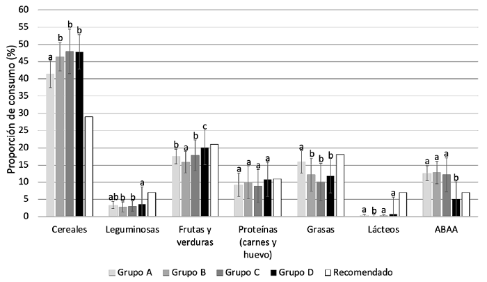 Por otro lado, de cada grupo de alimento (los primarios y los secundarios), se calculó el porcentaje medio de porciones de consumo diarias sobre los planes dietéticos saludables: entre 1 700 y 2 100 kilocalorías diarias (kcl/d) propuestas por la Guía alimentaria y de actividad física en contexto de sobrepeso y obesidad en la población mexicana (GAM) (Bonvecchio-Arenas et al., 2015). El cálculo del número de porciones se determinó a partir del valor de F multiplicado por el número reportado de porciones a la semana de cada alimento, el resultado se adecuó en porcentaje. Se utilizaron los siguientes parámetros para analizar los planes dietéticos saludables: 29% cereales, 7% leguminosas, 21% frutas y verduras, 11% proteínas (carnes y huevos), 18% grasas, 7% lácteos y 7% alimentos y bebidas altos en azúcar (ABAA).
