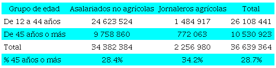 La Tabla 1 describe el total de trabajadores asalariados en México, que es de 36.63 millones, de los cuales 6.2% (2.26 millones) son jornaleros agrícolas. Cuando se divide a los trabajadores por grupo de edad, 28.7% de los trabajadores asalariados pertenecen al grupo de 45 años o más. Los asalariados no agrícolas presentan un porcentaje similar al total de los asalariados, pero al comparar los primeros con los jornaleros agrícolas (asalariados agrícolas) del grupo de 45 años o más, estos últimos tienen un porcentaje mayor: esto se puede deber a que, a pesar de que esta ocupación requiere un mayor desgaste físico, el hecho de que tenga una mayor precariedad obliga a trabajar a edades en las que un trabajador no agrícola y menos precario ya tiene acceso a la jubilación.