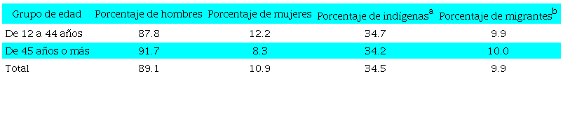 En la Tabla 2 se presenta la distribución de los jornaleros agrícolas por sus características sociodemográficas. En relación con el sexo, 89.1% de dichos jornaleros son de sexo masculino y solo 10.9% son de sexo femenino; el porcentaje de mujeres es más alto en el grupo más joven (12.2%) que en el de 45 años o más (8.3%). Esto corrobora lo que se ha venido observando desde 2000: un aumento en la participación laboral femenina en el sector jornalero agrícola, como lo documentó Barrón (2000). Es decir, en este sector se observa una mayor participación laboral femenina en los grupos etarios más jóvenes. Respecto a la etnicidad, 34% de los jornaleros agrícolas es indígena, porcentaje muy similar en ambos grupos de edad. En cuanto a condición migratoria, se observa que 10% es de trabajadores migrantes.