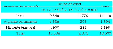 La Tabla 58 expone la distribución por condición de migración y grupo de edad. Los trabajadores locales son mayoría, pues constituyen 61.7% del total de trabajadores, mientras que los migrantes temporales representan 28.9% y los trabajadores migrantes permanentes, solo 9.4%. Para saber cuánto representa el grupo de trabajadores de más edad respecto al total de trabajadores por condición de migración, se dividió el número de trabajadores del grupo de edad de 45 años o más entre el total de trabajadores para cada categoría. De esta manera se observa que 15.9% de los trabajadores locales tiene 45 años o más, 18.0% es de los migrantes permanentes y solo 5.7% de los migrantes temporales se encuentra dentro de este grupo de edad. De esta tabla es posible deducir que los migrantes temporales son una población joven en su mayoría, pero que emigra porque ya cuenta con cierta experiencia en el campo, la cual pueden aprovechar para ser más productivos.