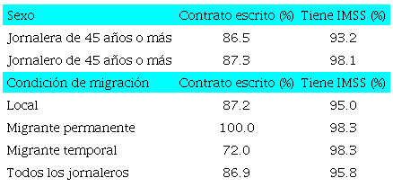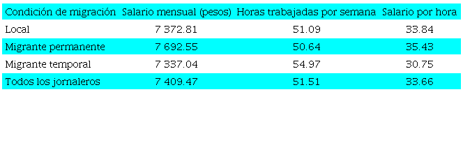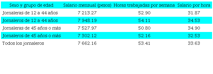 El salario mensual promedio es de 4 257 pesos, y es similar para hombres y mujeres. Se observa un promedio de 41.3 de horas trabajadas a la semana: los hombres trabajan 1.5 más horas que las mujeres. El salario por hora es de 27.7 pesos, que es un poco más alto para mujeres (29.5 pesos) que para hombres (27.5 pesos). El porcentaje de jornaleros agrícolas que ganan un salario igual o menor al mínimo es de 46.4%, y es más alto en hombres (47.0%) que en mujeres (43.1%). En relación con la prestación de salud, los jornaleros presentan una precariedad alta, pues solo 7.9% de ellos tiene acceso a esta: 6.9% hombres y 15.6% mujeres. Estos porcentajes son mucho menores que el 54% que presentan los asalariados no agrícolas. Cuando se diferencia por grupo de edad, los jornaleros de 45 años o más tienden a presentar un salario mensual más bajo, menor salario por hora. Además, hay un porcentaje mayor de personas que ganan un salario igual o menor que el mínimo en comparación con aquellos trabajadores de entre 12 y 44 años. En cuanto al acceso a la salud, los porcentajes son muy similares en ambos grupos, aunque algo menor en las mujeres de 45 años o más (13.2%) que en las mujeres del grupo de entre 12 y 44 años (16.5%). Estas cifras se comportan de modo similar tanto en hombres y mujeres como en el total de los trabajadores, lo cual da cuenta de una precariedad un poco más alta en el grupo de mayor edad en comparación con el grupo de entre 12 y 44 años.