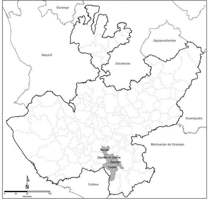 La información analizada proviene de dos tipos de fuentes: estadística y etnográfica. La primera, del Censo de Población y Vivienda 2020 (Instituto Nacional de Estadística y Geografía [INEGI], 2021) y de la Encuesta de Jornaleros de Cultivos de Exportación (ENJOREX) que se recabó entre marzo y mayo de 2019; el diseño y los resultados principales de la ENJOREX 2019 se encuentran en Escobar, Martin y Stabridis (2019). El uso del Censo de Población y Vivienda 2020 tiene el objetivo de contextualizar, a escala nacional, las condiciones laborales de los jornaleros agrícolas en general y de los mayores de 45 años en particular. La ENJOREX 2019 se utilizó para describir las condiciones laborales en el cultivo de berries del sur de Jalisco, en particular de los municipios de Sayula, Zapotlán El Grande, Tuxpan y Zapotiltic. Se escogieron esos municipios porque son los principales productores de berries de esta región. Su ubicación se puede observar en la Figura 1. La información recabada de forma etnográfica tuvo el fin de dar cuenta de las condiciones laborales y de vida de las jornaleras y los jornaleros de 45 años o más.