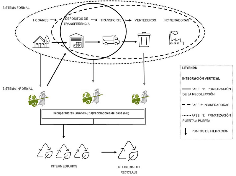 El modelo neoliberal puesto en marcha a principios de la década de 1980 replanteó el manejo de los residuos en muchos países de América Latina, el cual causó una redistribución de la renta en el sector con nuevos ganadores y perdedores (Dias, 2016; Villanova, 2012). En particular, el modelo de gestión integral de residuos sólidos (GIRS) (Tchobanoglous, Vigil y Theisen, 1994), intensivo en capital y tecnología, mediante características más afines a los criterios de competitividad y productividad propios de la iniciativa privada, limitó a los participantes del sector público, porque las empresas privadas serían los nuevos beneficiarios del manejo y gestión (Villanova, 2012). Su orientación de mercado y el respaldo de las instituciones impulsaron la mercantilización de los residuos como modelo de negocio para la acumulación de capital. Esta situación provocó que comenzara la expropiación de residuos y que se impidiera el acceso a los trabajadores informales (Demaria y D’Alisa, 2012), caracterizados por la precariedad de sus condiciones de trabajo, la baja calificación y la ausencia de organización. El modelo de GIRS vino a socavar aún más sus condiciones de trabajo (Dias, 2016; Valente y Guevara, 2019).