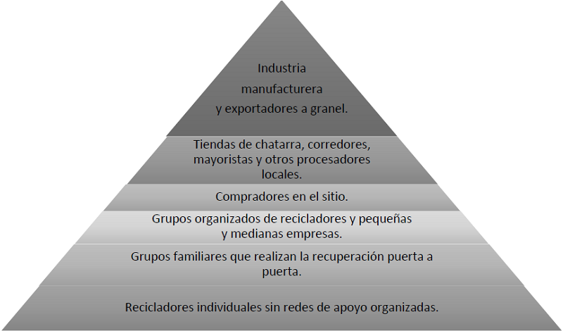 En esta cadena, los pepenadores conforman la base trabajadora (véase Figura 2), y los propietarios de las recicladoras y de las fábricas de reciclaje se colocan por encima de ellos. Esa jerarquía organizacional define la distribución de la renta del sector, que se concentra en los dueños de las fábricas y después en los intermediarios, ambos beneficiarios del trabajo a destajo de los RU y del hecho de que no pagan seguridad social ni las prestaciones que exigen las leyes del trabajo (Florisbela dos Santos y Wehenpohl, 2001; Villanova, 2012).