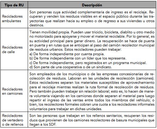 Es usual que en los países en desarrollo los RU trabajen en los sitios de disposición final (SDF), en la vía pública de las ciudades o en los camiones de los servicios municipales de recolección de residuos urbanos. En la mayoría de los casos no están organizados, lo que les impide dar impulso al RI en sus municipios. También padecen los bajos precios que los intermediarios de la cadena del reciclaje imponen a los materiales recuperados. En la Tabla 1 se presentan los tipos de RU que hay en América Latina y se aprecian las características necesarias para que se creen procesos orientados a formalizar sus condiciones de trabajo.