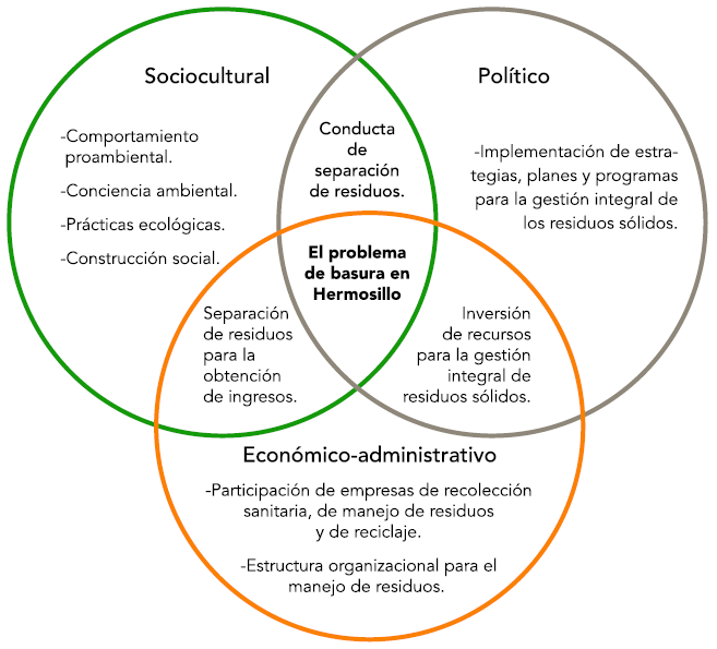 Si el problema de la basura y la gestión de residuos se trata como política pública, se podrían clasificar los componentes de tal gestión: políticos, socioculturales y económico-administrativos (véase Figura 1). En el componente político se incluyen la política pública, la vigilancia y la sanción a quien dañe el medio ambiente. En el económico-administrativo está el valor de la basura cuando es vista como residuo aprovechable y hay voluntad por parte de las organizaciones y de los ciudadanos para trabajar en el tema. En cuanto a la esfera sociocultural, esta contempla la construcción social del problema de la basura, los hábitos de consumo, las formas de acumulación y recolección y el comportamiento proambiental, entre otros.