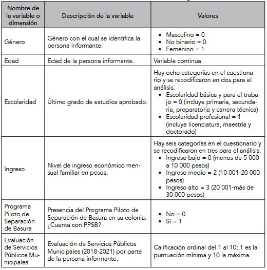 También se utilizó la prueba U de Mann-Whitney para comparar las respuestas entre los habitantes de las colonias con y sin programa. Por último, se realizó el análisis de regresión lineal múltiple para evaluar el efecto de las variables socioeconómicas, las dimensiones psicológicas relacionadas con la conducta del manejo de residuos y las variables sobre la construcción social del problema de la basura, utilizando la dimensión “activa” (frecuencia autorreportada de las prácticas de manejo de residuos) como variable dependiente. En la Tabla 2 se resumen y se describen las variables que se usaron en el modelo de regresión.