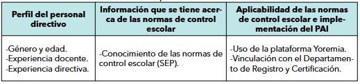 En primer lugar, se muestra el perfil del personal directivo y su trayectoria profesional, seguido de los resultados que indican el conocimiento y la información que tiene de las Normas Específicas de Control Escolar. Por último, se presentan los testimonios del personal acerca del uso y conocimiento de las normas de control escolar en los procesos administrativos de inscripción (PAI), cuyo análisis se concentra en las diferentes estrategias que los directivos han usado para ponerlas en marcha.