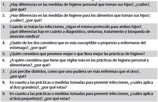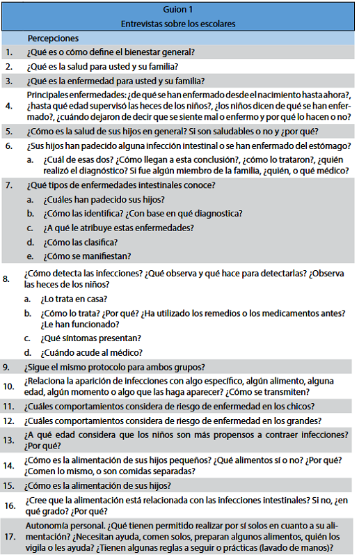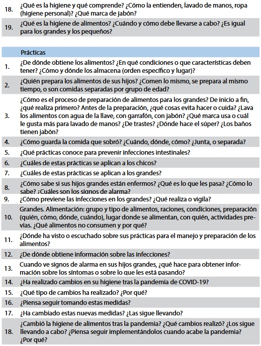 El primer guion incluye puntos de conversación enfocados en la obtención de las percepciones de las madres sobre la higiene alimentaria en función de las edades de sus hijos. Los temas centrales se vinculan con el rol que ellas tienen con los alimentos de sus hijos, las consideraciones para elegirlos y si estas son iguales o diferentes según la edad de sus hijos. Además, se profundizó en la forma en que las madres perciben los procesos de salud y de enfermedad, la relación con los alimentos y cómo resuelven las infecciones intestinales, en caso de haberlas mencionado. El segundo guion explora y profundiza en las medidas de higiene que practican las madres durante la preparación de los alimentos, cómo y qué conceptos implementan y enseñan a sus hijos en relación con esas prácticas.