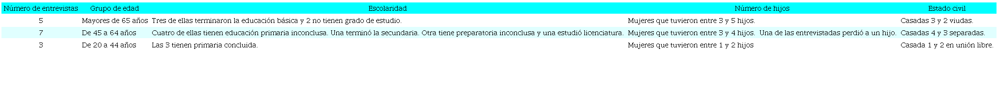 Los siguientes testimonios de las mujeres zoques dedicadas a la panadería artesanal en Ocozocoautla de Espinosa corresponden a las entrevistas en las que las participantes compartieron sus historias de vida y las adversidades que han enfrentado en la panadería artesanal. Los temas más destacados fueron la identidad, los motivos, los recuerdos, la educación, la economía, la familia, el matrimonio, la discriminación, el desempleo y las estrategias de comercialización.
