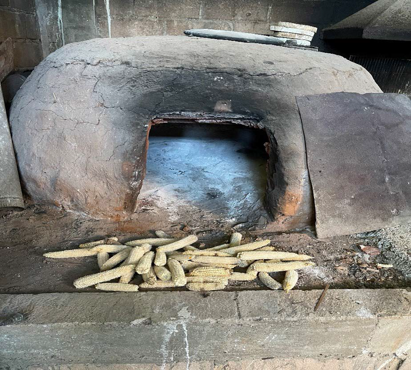 Un día, con la desesperación por trabajar, recordé que mi mamá nos enseñó a construir el horno de barro. Así que decidí construirlo aquí mismo, en el patio de la casa. Conseguí block y cemento para la base, y luego ladrillos que cubrí con una mezcla de barro, pasto fino picado y excremento de res esterilizado con agua caliente. En la base coloqué una capa de ladrillos con sal y cristal triturado para mantener el calor, todo bien compactado y sellado con barro. (PA_10. Marzo de 2023)