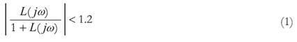 En este paso se definen las especificaciones de estabilidad en el dominio de la frecuencia. Se usa una función de ponderación para condicionar la magnitud de T( jω) y así establecer una restricción de estabilidad robusta sobre el lazo abierto nominal (Ljj = PjjGj, donde j = 1, 2; Pjj es el elemento ( j, j) de la planta nominal multivariable de 2 × 2 y Gj es el control del lazo correspondiente). En la práctica no existe una especificación para estabilidad robusta en la planta. Buscando una respuesta aceptable, se usó la siguiente restricción, la cual es común en control regulatorio y demanda una respuesta a un escalón unitario con un sobrepaso máximo de 20 por ciento: