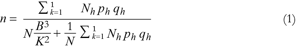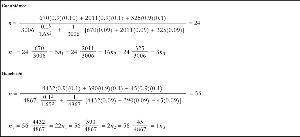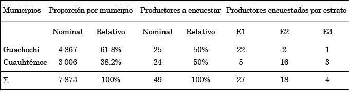La muestra se determinó con base en los predios de temporal registrados en el padrón de procampo de Guachochi y Cuauhtémoc, de acuerdo con el procedimiento indicado en la técnica de muestreo estratificado por asignación proporcional, en la cual el tamaño de cada estrato en la muestra es proporcional a su tamaño en la población, y se determina con la siguiente fórmula (Mendenhall y Reinmuth, 1981):3