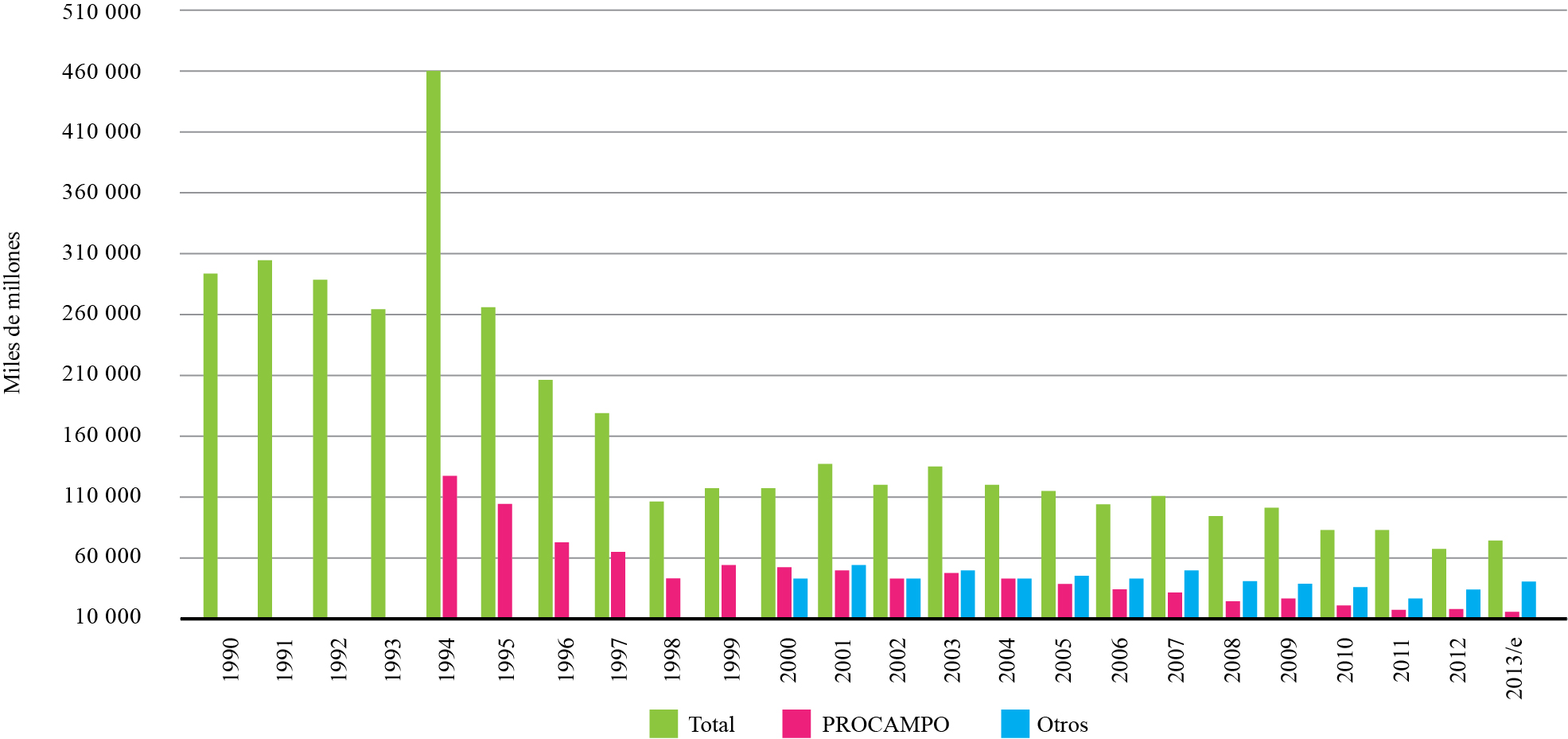 En este sentido, procampo fue el programa más importante de subsidios agrícolas en México. Durante su operación, en promedio representó 30% del presupuesto ejercido por la Sagarpa, en 1990 y 2000 se registra el mayor incremento en su presupuesto con 44 y 42% de total respectivamente.