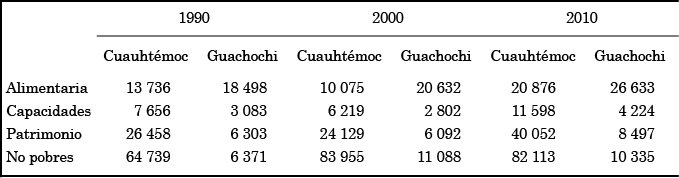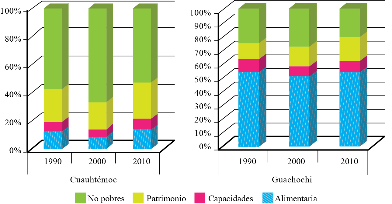 En este contexto, el balance sobre la situación de la pobreza por ingresos en los municipios de Cuauhtémoc y Guachochi muestra un resultado desfavorable, ya que el número de personas en situación de pobreza alimentaria en 2010 es mayor al número de personas que se encontraban en dicha situación para 1990.
