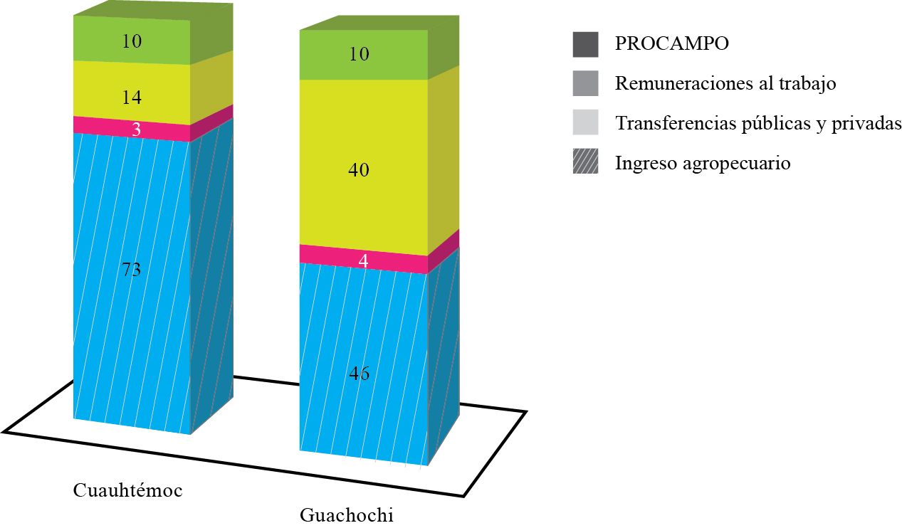 Con la información recabada de la encuesta, se describe la composición del ingreso de los beneficiarios de los municipios de Guachochi y Cuauhtémoc para el periodo de análisis y se abordan los siguientes componentes: a ) ingreso agropecuario, b ) remuneraciones al trabajo, c ) procampo y d ) transferencias públicas y privadas.