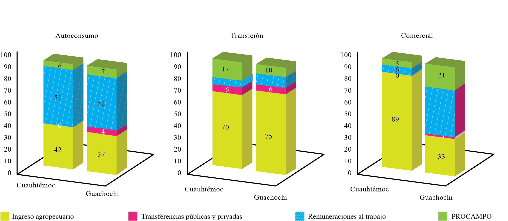 Para finalizar, en el estrato de agricultores comerciales existe una gran diferencia entre los municipios puesto que para el municipio de Cuauhtémoc el principal componente del ingreso es el agropecuario, pues representa 89% del ingreso total, mientras que en el municipio de Guachochi son las remuneraciones al trabajo con una participación de 45 por ciento.