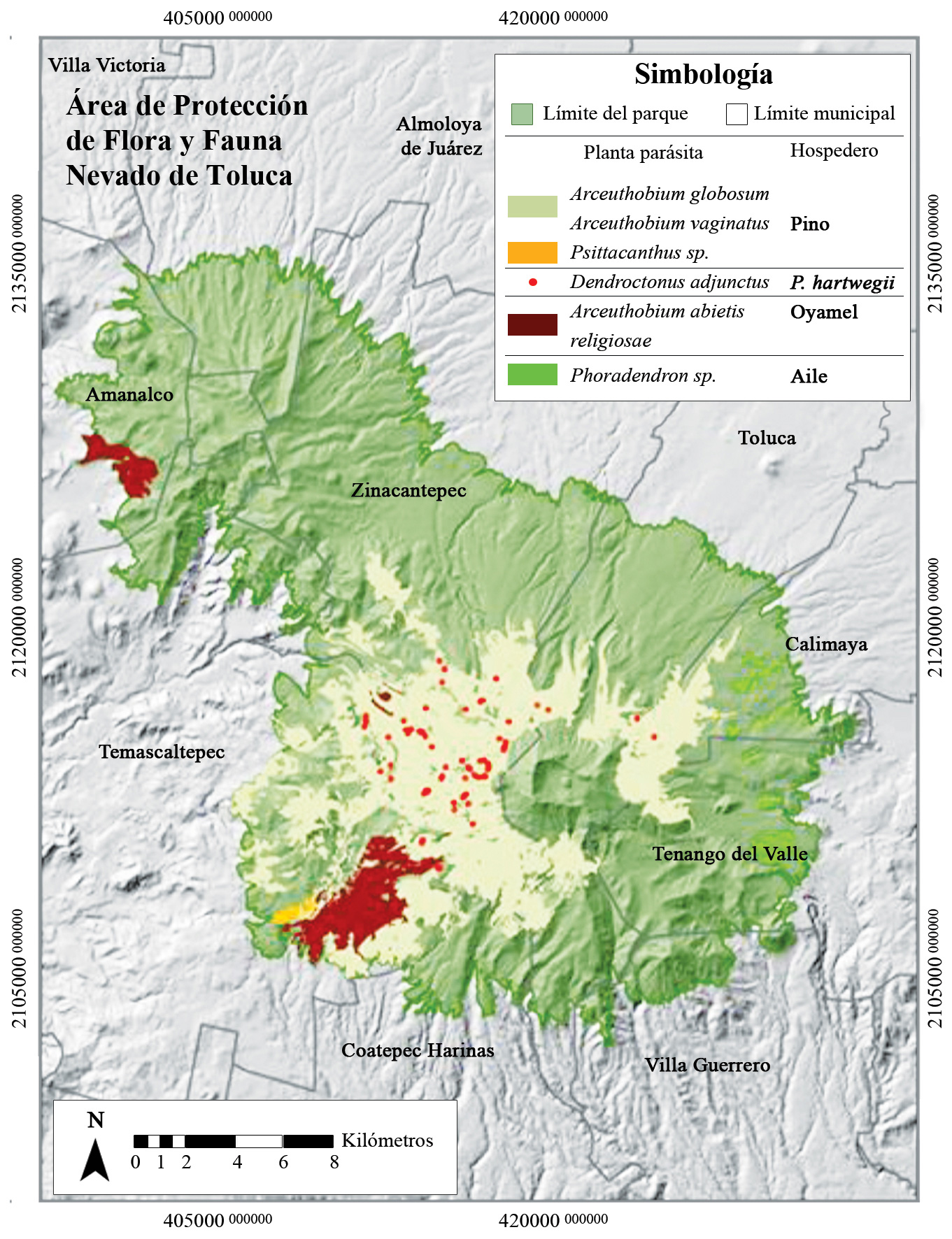 El estado fitosanitario actual es el reflejo de extracciones inmoderadas en años pasados, así como una fuerte presión de actividades agropecuarias, sobre todo en el bosque de pino. Aunado a esto, la biología del descortezador de los pinos de montaña (Dentroctonus adjunctus) parece haber sufrido cambios importantes, como lo es el aparente traslape de sus generaciones, debido a que en la actualidad se observan brotes durante todo el año, además de encontrar en un mismo árbol al insecto en todas sus etapas de desarrollo (Endara et al., 2013). En relación con la incidencia de las plantas parásitas, como el caso de los muérdagos enanos (Arceuthobium globosum y A. vaginatum), sin duda ocasionan mayores daños en el apffnt , porque alcanzan un 60% de afectación en el bosque de pino (mapa 2). Esto conlleva a replantear urgentemente la aprobación de programas y proyectos de saneamiento destinado al derribo de arbolado parasitado por muérdago donde se precisen los procedimientos para tal fin y continuar con investigaciones del muérdago sobre el conocimiento farmacológico, el cual se encuentra en proceso de investigación, así como la valoración de sus propiedades nutricionales (Endara et al., 2013).