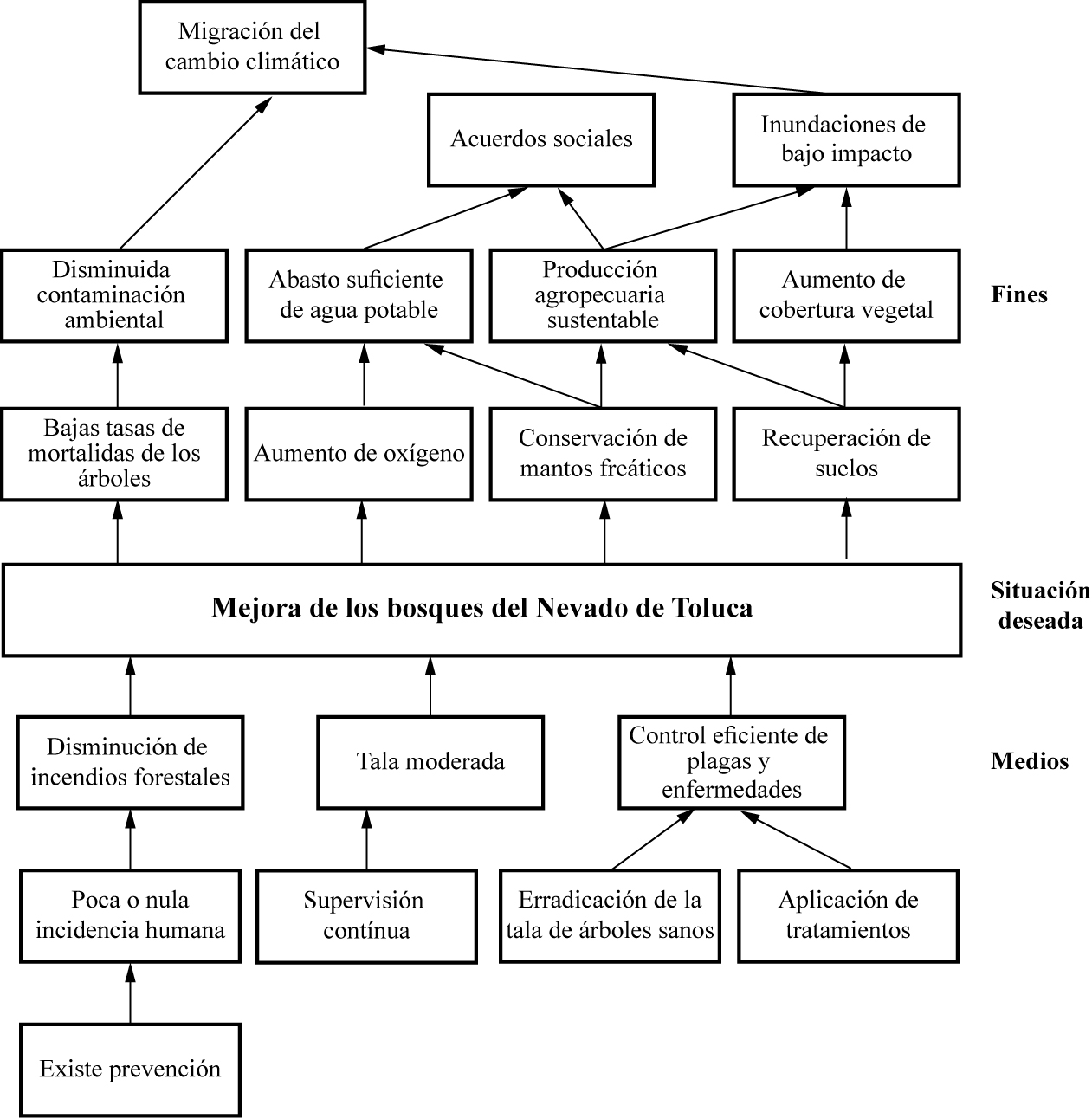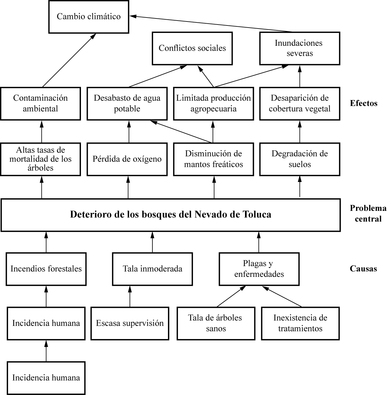 La estructura de este artículo presenta una primera parte que se basa en la evidencia geográfica del deterioro de los ecosistemas forestales del anpffnt . Después se presenta un diagrama (árbol de problemas) y un diagrama de soluciones como herramientas de análisis ante la actual situación del deterioro de los bosques. La tercera parte plantea el establecimiento de líneas generales de acción o estrategias de manejo y conservación, con la participación voluntaria y responsable de los actores locales convencidos por el conocimiento del problema y su deseo de involucrarse en el mantenimiento del recurso forestal y del equilibrio ambiental de la zona de estudio. Finalmente el artículo propone escenarios deseables para el bosque y un acercamiento prospectivo para la sustentabilidad del Área Natural Protegida de Flora y Fauna Nevado de Toluca.