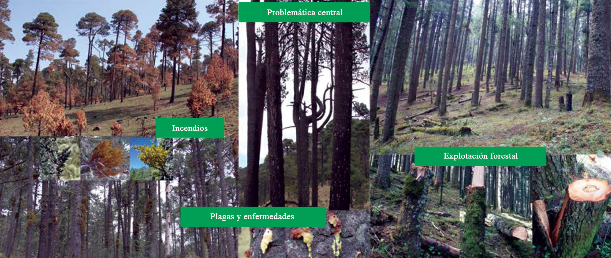 En un análisis temporal de los mapas forestales del anpffnt se puede evidenciar la reducción en las densidades de cobertura de los bosques de pino (mapa 1); esto implica la extracción de arbolado adulto con las mejores características fenotípicas, que tiene como consecuencia un ecosistema residual con árboles enfermos o decrépitos, los cuales son ahora el soporte semillero para las futuras masas forestales. Lo anterior implica la pérdida de poco más de 40% de los bosques de pino densos (Franco et al., 2006), lo que ha provocado un incremento de las superficies infestadas por plagas y plantas parásitas; esta última ha llegado a parasitar hasta un 60% de los árboles de pino en bosques fragmentados o abiertos (Endara, 2010; Endara et al., 2013).