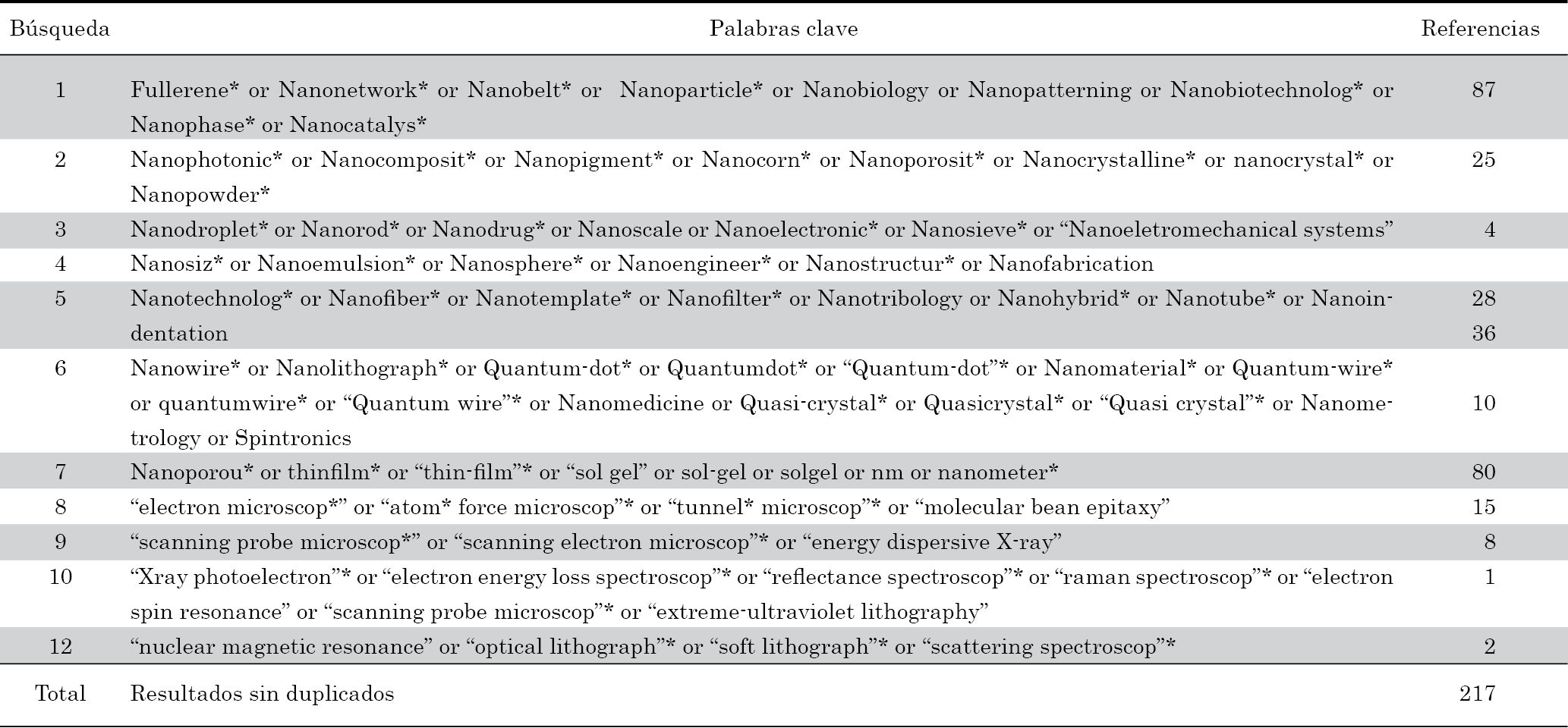 Luego de que varios países lanzaron iniciativas o programas nacionales de nanotecnologías, las aplicaciones y otorgamiento de patentes en el área se dispararon. Analistas calculan que las patentes de nanotecnologías aumentaron más de diez veces entre el 2000 y el 2012 en el mundo (Jordan et al., 2014). Dado el incremento de patentes en nanotecnologías, la ipc (International Patent Classification) ha elaborado una categoría que permitió su clasificación en una subclase a partir de 2011, la B82Y. Esta subclase se subdivide, a su vez, en nueve grupos; pero esta nueva clasificación de patentes de nanotecnologías no cubre aquellas registradas antes del 2011, y tampoco cubre necesariamente todas las que se registran después, por lo cual hubo de aplicarse términos técnicos de búsqueda en la base de datos de la Oficina Europea de Patentes ( oep ).