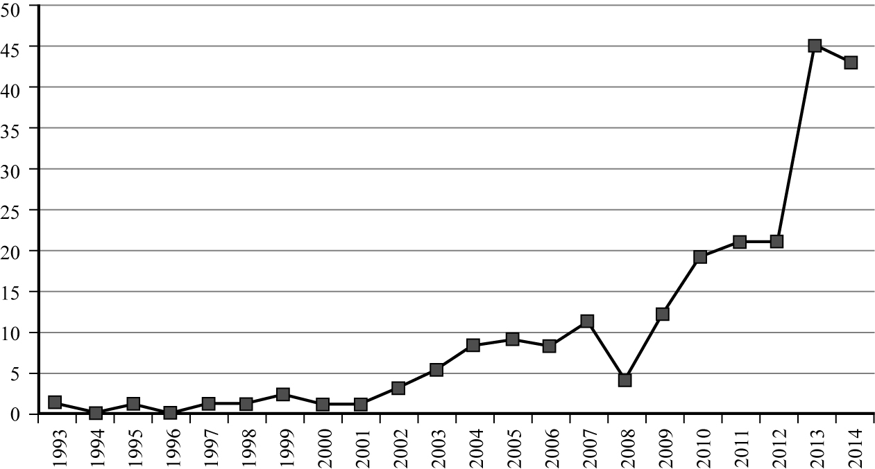 Existen diversas bases de datos de patentes. Para esta investigación se utilizó la base de datos de la Oficina Europea de Patentes ( epo , por sus siglas en inglés), una de las más grandes que existen, y que ofrece el servicio Espacenet de consulta. A partir de una búsqueda por palabras clave (anexo 1) de inventores con residencia en México se identificaron 217 patentes de nanotecnologías entre 1993 y 2014.6 Las patentes son uno de los indicadores más utilizados para medir innovación, competitividad, y otras dimensiones sociales, económicas y jurídicas. La gráfica 1 muestra la evolución de las patentes con inventores mexicanos en el periodo de estudio.