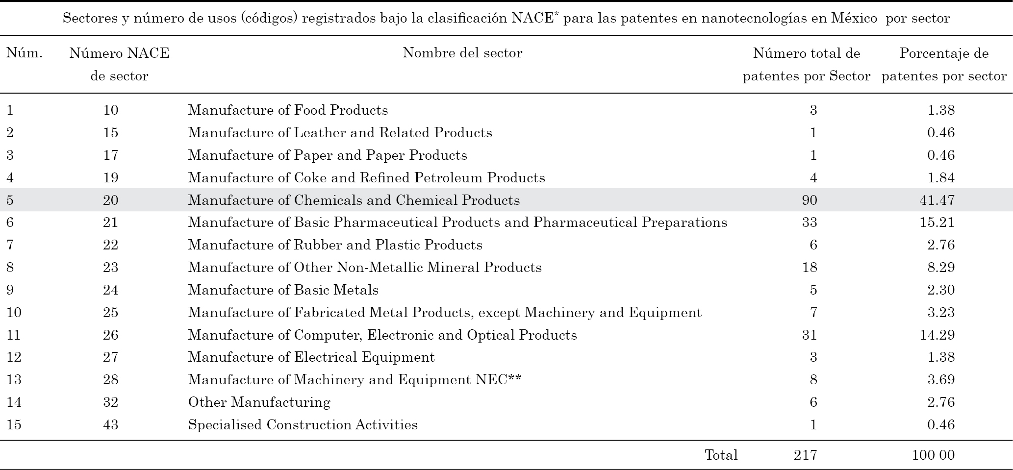 Las patentes mexicanas de nanotecnologías sólo cubren 15 sectores de la clasificación nace , de un total de 27. El registro de invenciones mexicanas en nanotecnologías (patentes) deja fuera doce sectores económicos de la clasificación europea; es decir, en dichos sectores no ha habido innovación manifiesta en patentes en nanotecnologías. Estos sectores manufactureros sin patentes son bebidas, tabaco, textiles, vestimenta, madera y productos de mimbre, impresión, grabación y reproducción de medios de comunicación, vehículos y otros equipos de transporte, muebles, ingeniería civil y computación.
