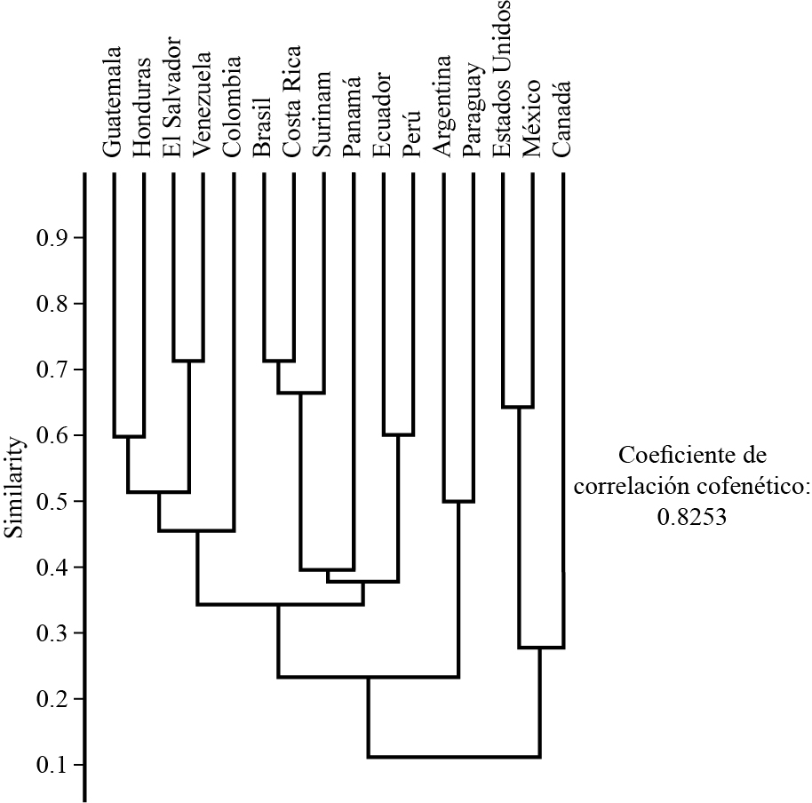 Se obtuvo una matriz de 16 filas por 20 columnas, desde la cual se calculó el índice de similitud de Jaccard (Crisci y López-Armengol, 1983) para las especies entre los distintos países de América. Posteriormente, se realizó un análisis de agrupamientos con upgma (técnica de ligamiento promedio no ponderado) y se obtuvo un dendrograma.