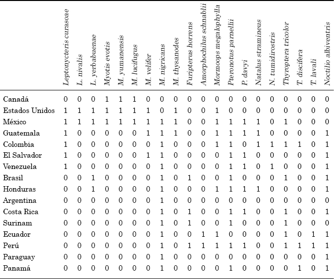 En el apartado de método se detalló la elaboración de la base de datos, a partir de la información disponible en gbif , con la cual se construyó una matriz de presencia (1) o ausencia (0) de las especies de murciélagos en 16 países del continente americano, que se muestra en el cuadro 1. Como la información de los registros biogeográficos disponibles en gbif está categorizada por países, se decidió retomar estos límites políticos para construir la matriz, aunque sea discutible su validez para manifestar fenómenos biológicos.