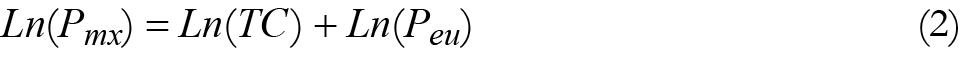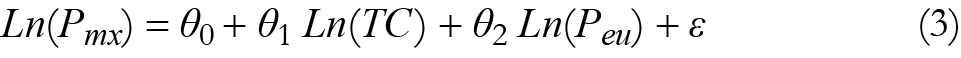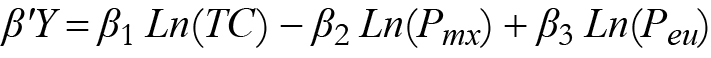 Donde Pmx = precio del maíz en México pesos/ton, TC = tasa de cambio peso/dólar y Peu = precio de maíz en Estados Unidos dólar/ton.