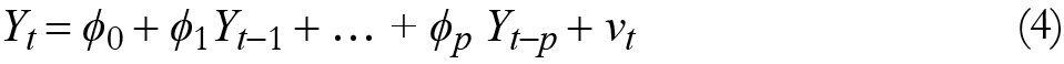 Donde Yt = es un vector m × 1; φ0 es un vector m × 1 de ordenadas al origen; φ1,..., φp = son matrices m × m de parámetros desconocidos; Yt-1,…, Yt-p = son vectores m × 1 conteniendo el rezago 1 hasta p ; con p = al orden del rezago del vector y vt = es un vector aleatorio de error m × 1.